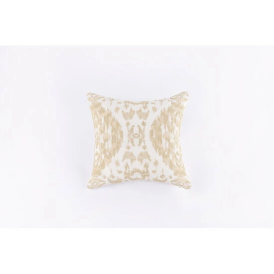 This pillow features tan abstract patterns on a white base. Material: 100% CottonSize: 16 x 16 inchesRemovable cover and includes a polyester insertCare Instructions: Machine Wash Cold, No Bleach. Gentle Cycle. Tumble Dry Low or Flat or Line Dry. Do not Dry Clean