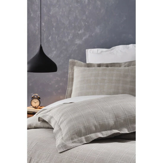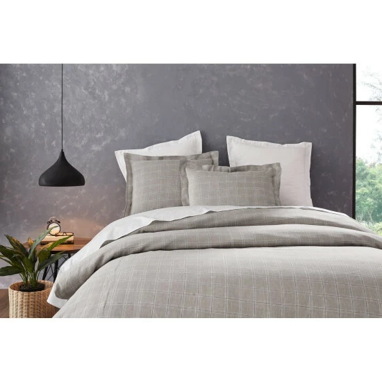Linen duvet cover has a subtle yarn dyed windowpane plaid that nods to a men’s summer suiting aesthetic. Modern yet rustic appeal. Soft window pattern with a calming effect to any bright room without overpowering a whit linen.